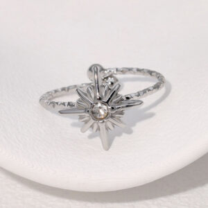 Μοντέρνο δαχτυλίδι από ανοξείδωτο ατσάλι με οκτάκτινο αστέρι και διαμάντια ασημί